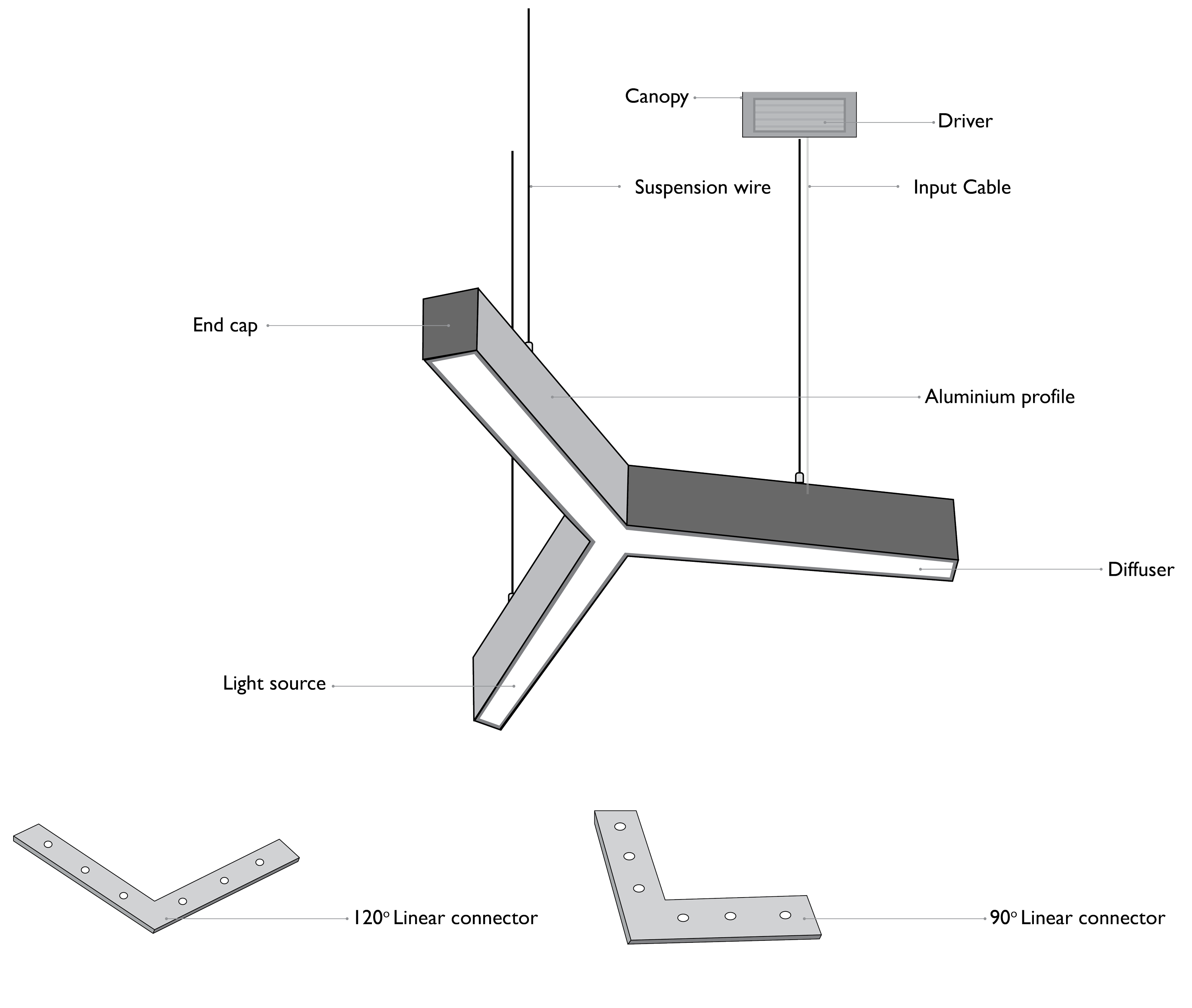 Designed with the unique manufacturing process, this Y shape Linear light provides zero light leakage and zero gaps between the joints of the fixtures. Based on the design and requirements, the Linear extrusions can be chosen among the models of 4265, 5270, and 6280 Linears. *Any geometrical shape can be designed and manufactured according to the requirement.